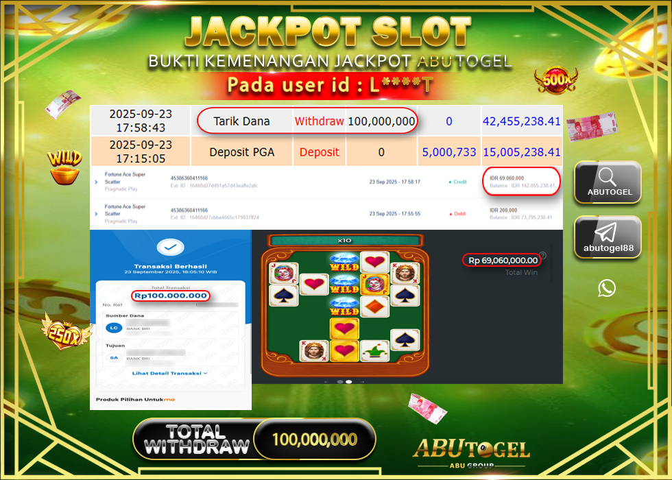 Berikut adalah Bukti Jackpot ABUTOGEL Slot Online Rabu 24 September 2025 :