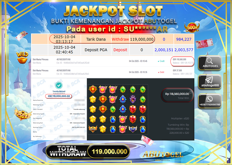 Berikut adalah Bukti Jackpot ABUTOGEL Slot Online Sabtu 04 Oktober 2025 :
