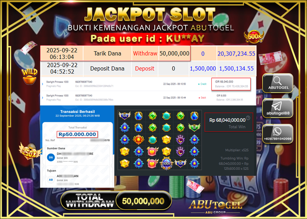 Berikut adalah Bukti Jackpot ABUTOGEL Slot Online Senin 22 September 2025 :